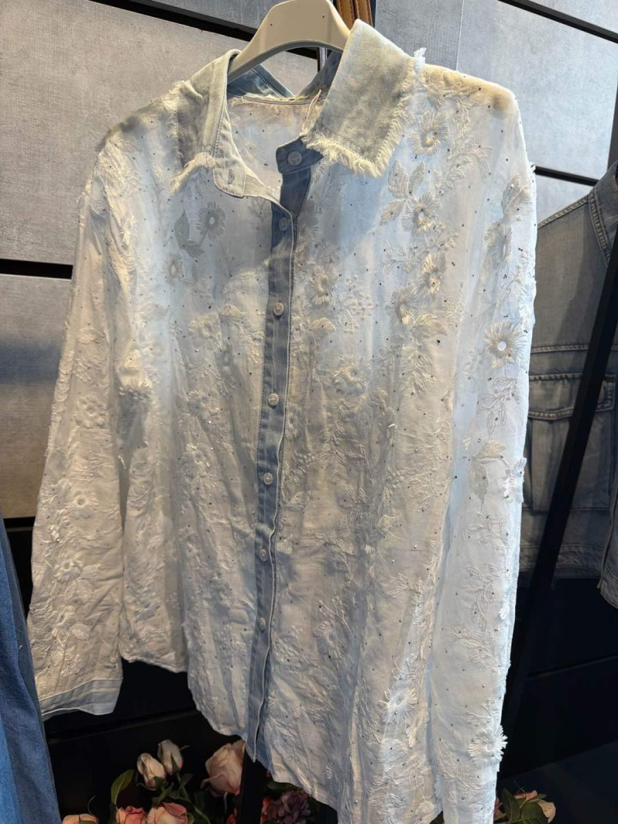 Ženska bluza , srajca v kombinaciji z jeansom in izvezenimi rožicami in posuta z kristalčki.