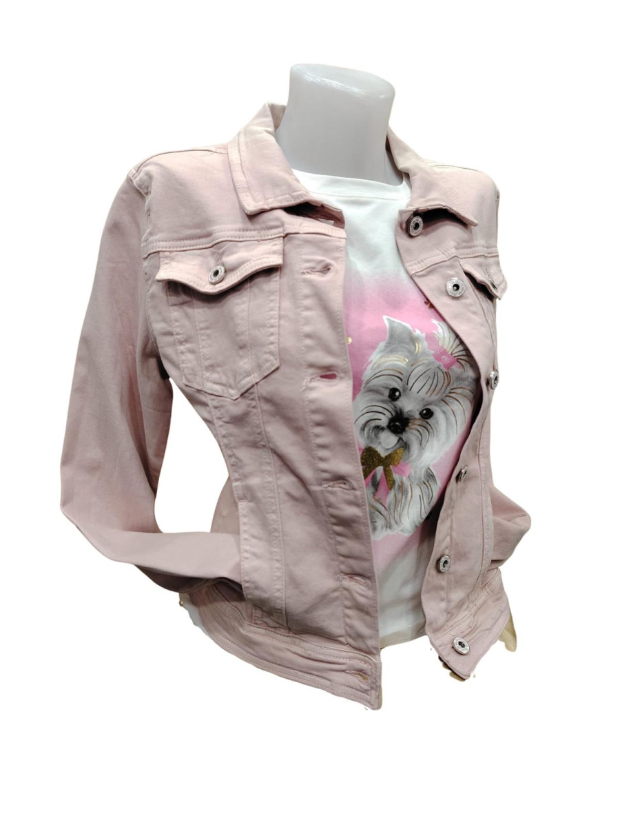 Moderna jeans jakna , ki ima dva žepa v predelu prsi .