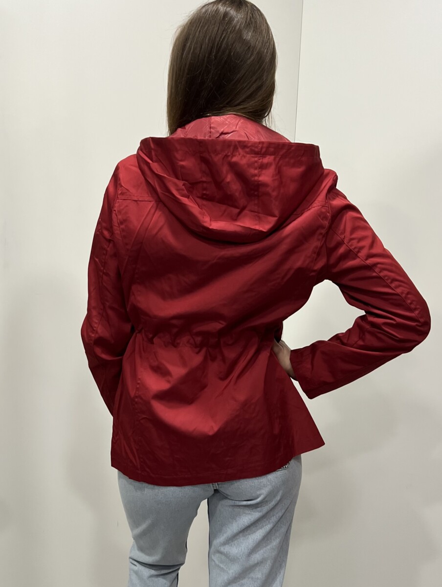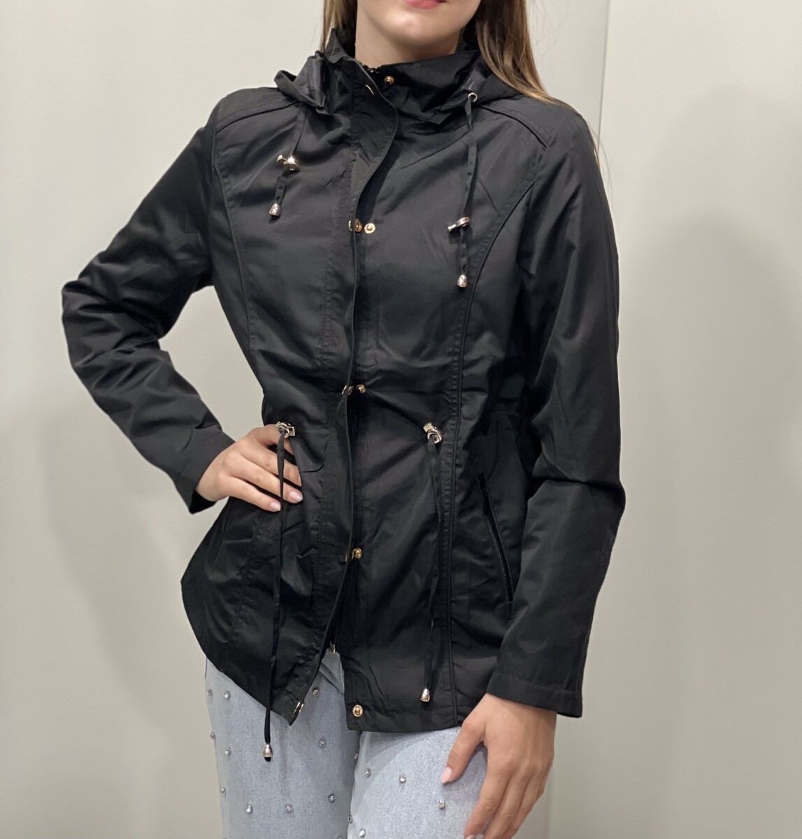 Lahka ženska vetrovka z zapiranjem na zadrgo. Ima kapuco, z elastiko za regulacijo.